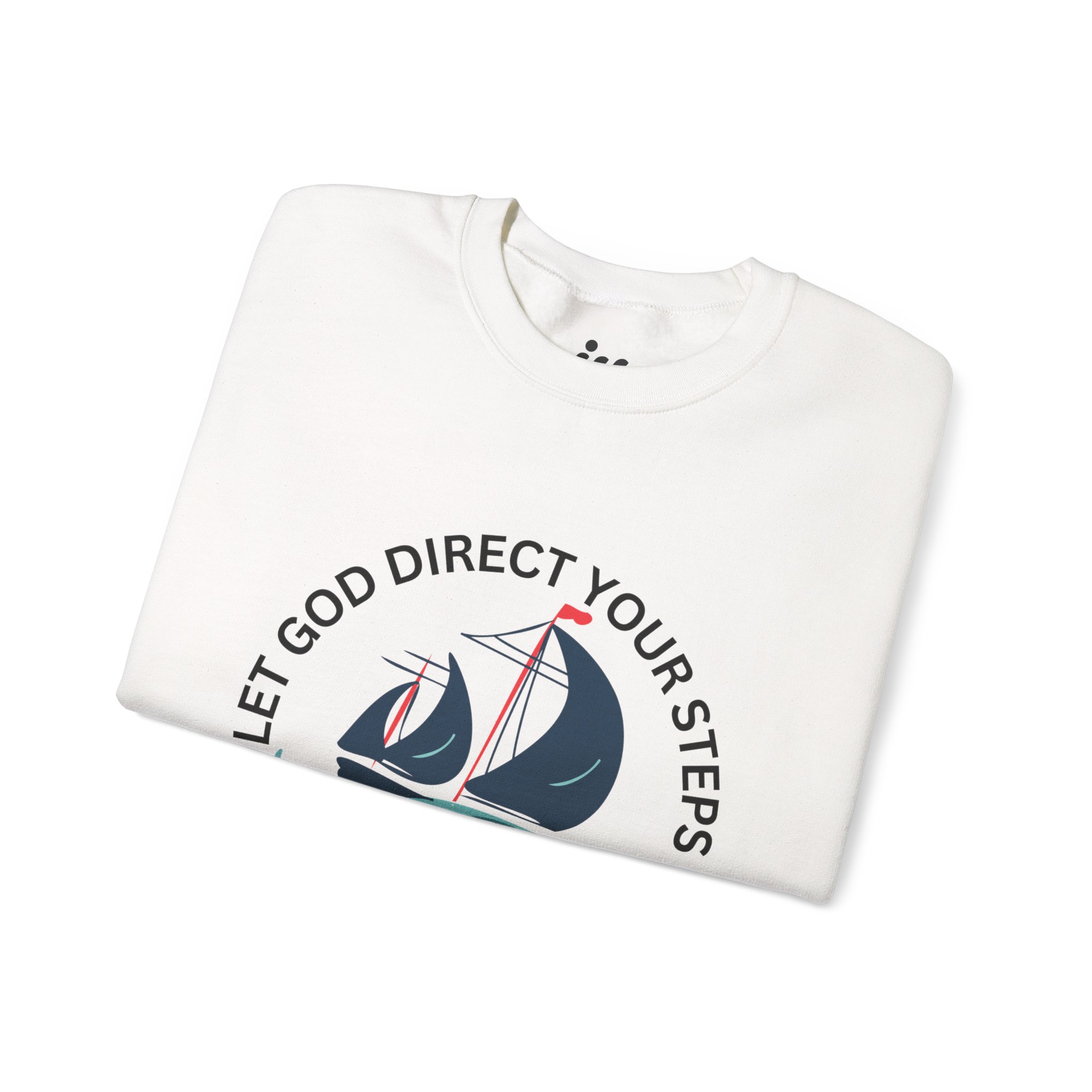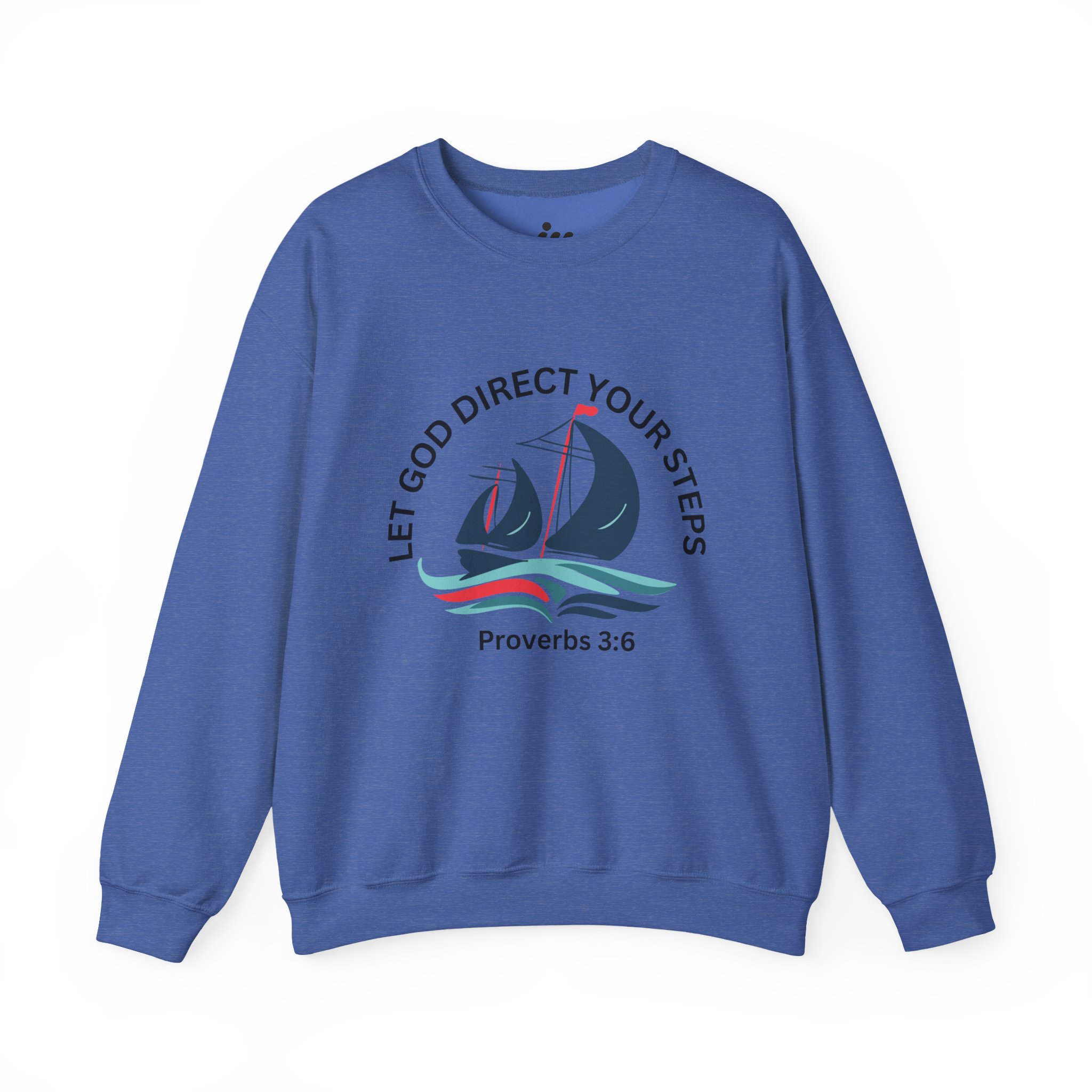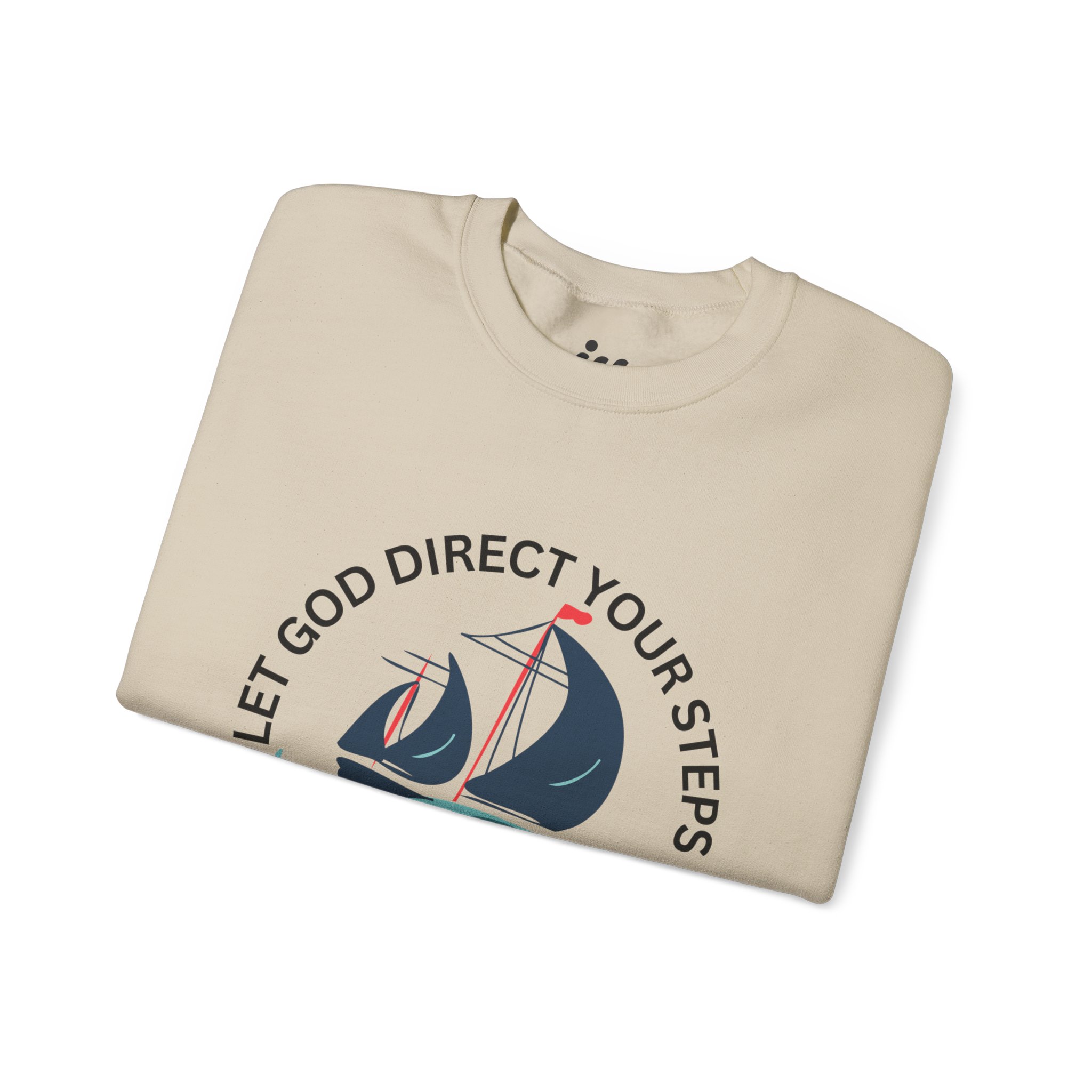 A soft, mid-weight crewneck sweatshirt that carries a calm, faith-centered message. The front shows a simple sailboat motif with gentle waves and the verse “Let God direct your steps — Proverbs 3:6,” rendered in muted navy, teal, and coral tones. The classic fit and ribbed collar give it a clean silhouette for layering or lounging. It feels like a quiet, reassuring hug on cool mornings — the kind of piece you reach for before church, a coastal walk, or an evening of reflection with friends and family.