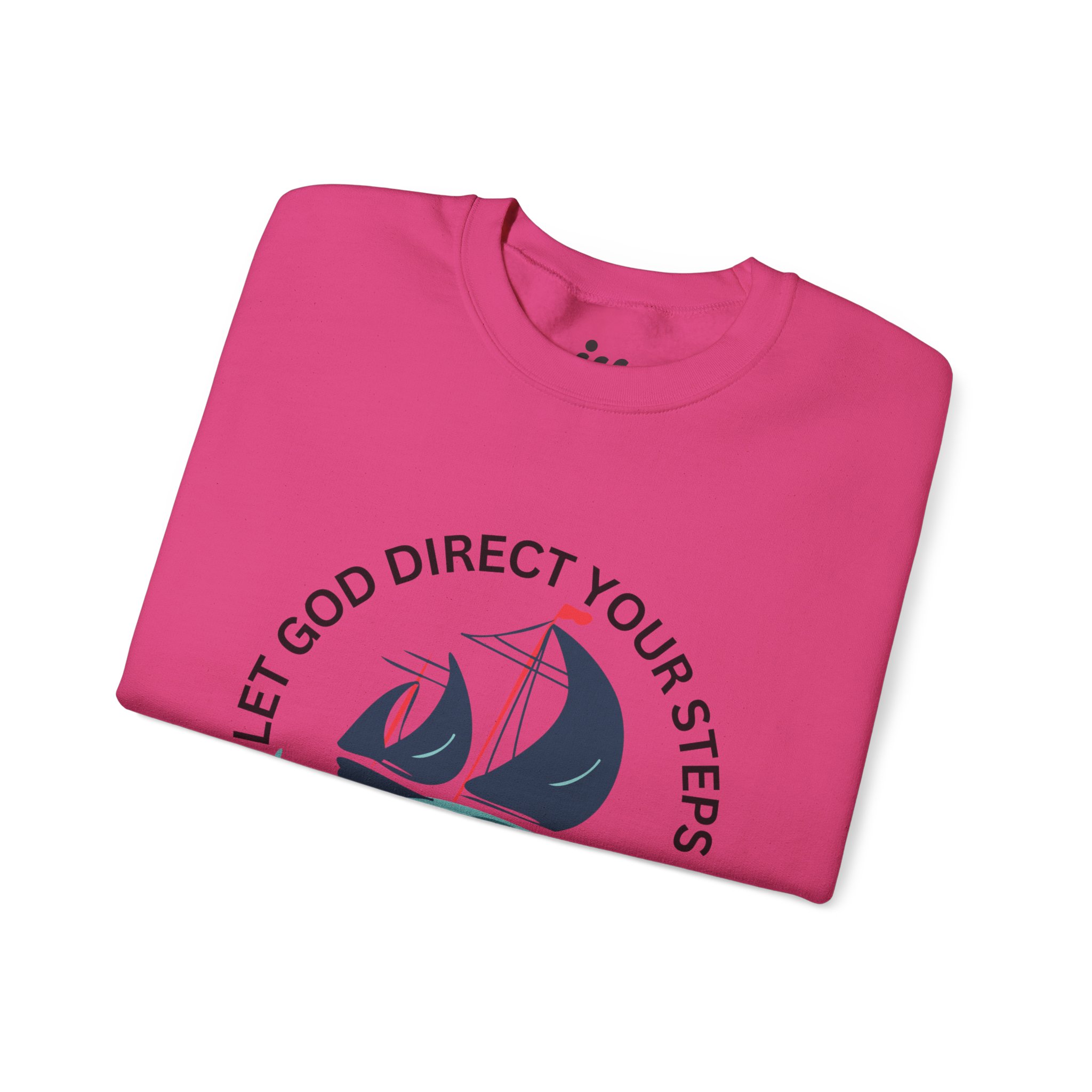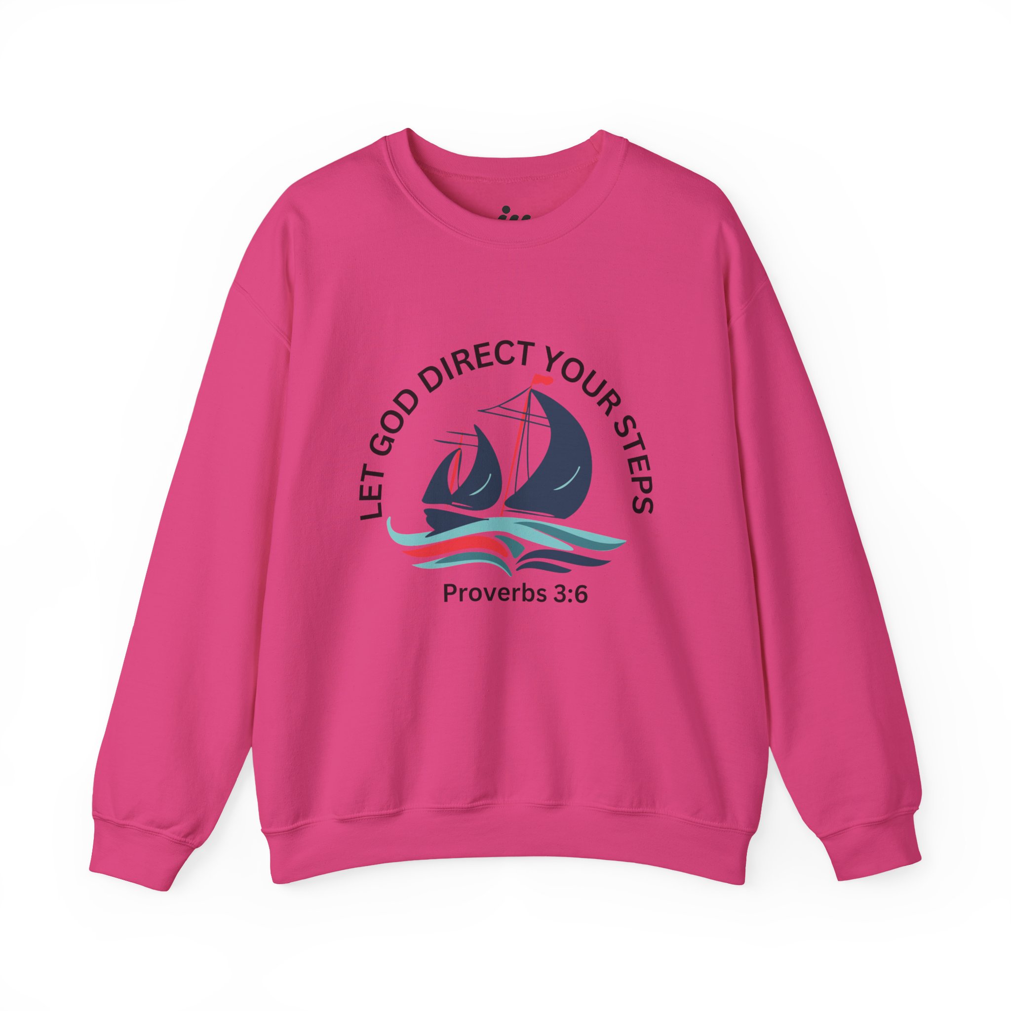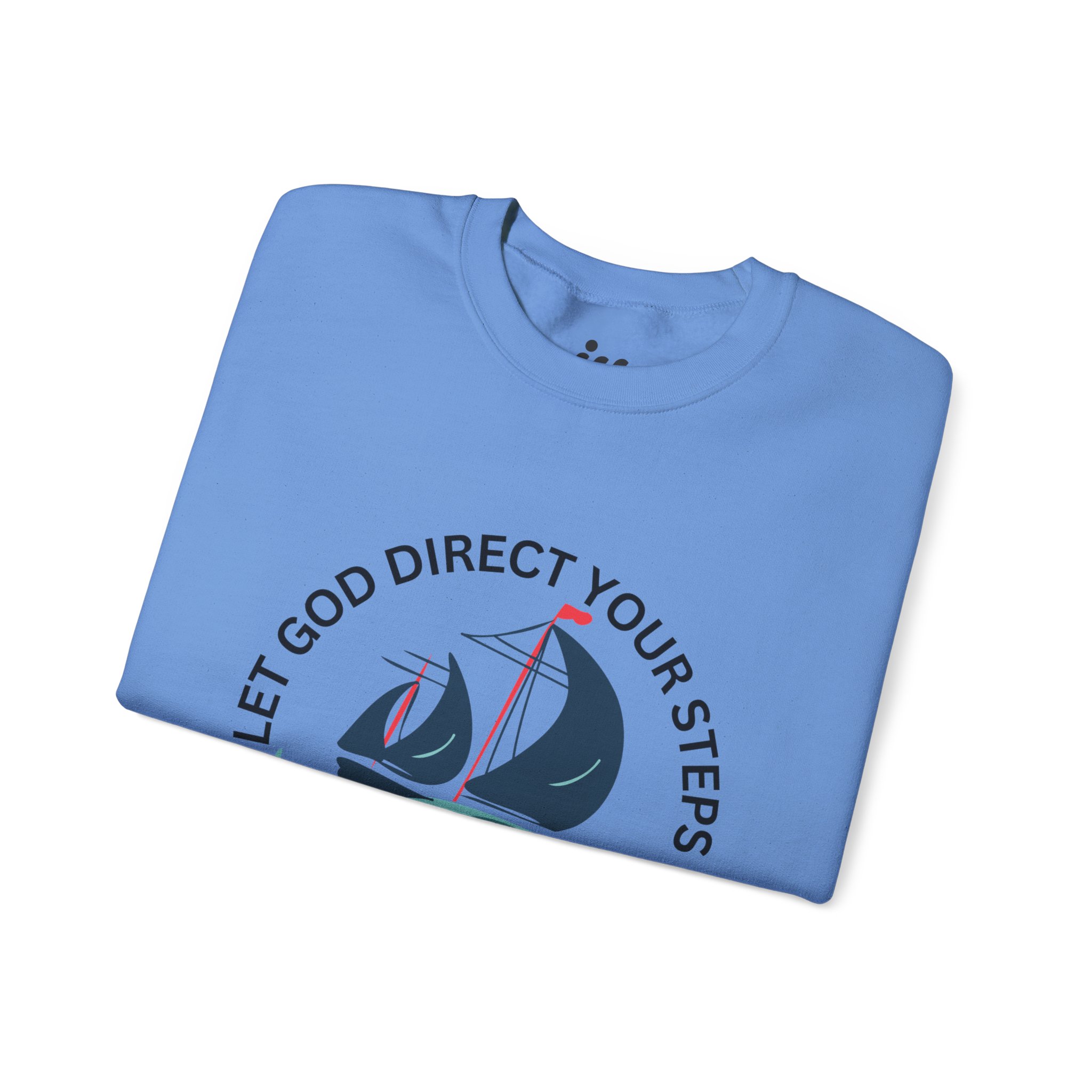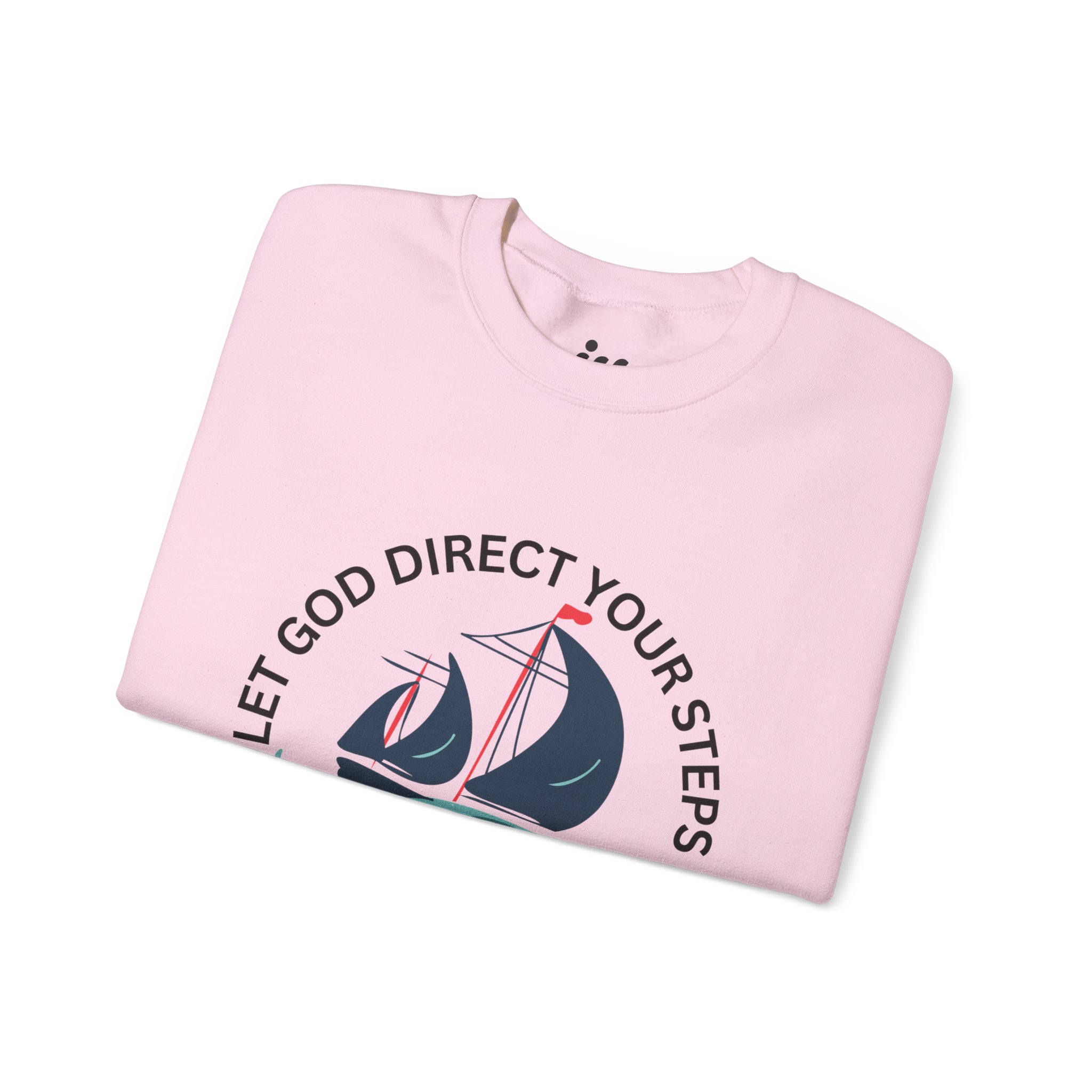A soft, mid-weight crewneck sweatshirt that carries a calm, faith-centered message. The front shows a simple sailboat motif with gentle waves and the verse “Let God direct your steps — Proverbs 3:6,” rendered in muted navy, teal, and coral tones. The classic fit and ribbed collar give it a clean silhouette for layering or lounging. It feels like a quiet, reassuring hug on cool mornings — the kind of piece you reach for before church, a coastal walk, or an evening of reflection with friends and family.