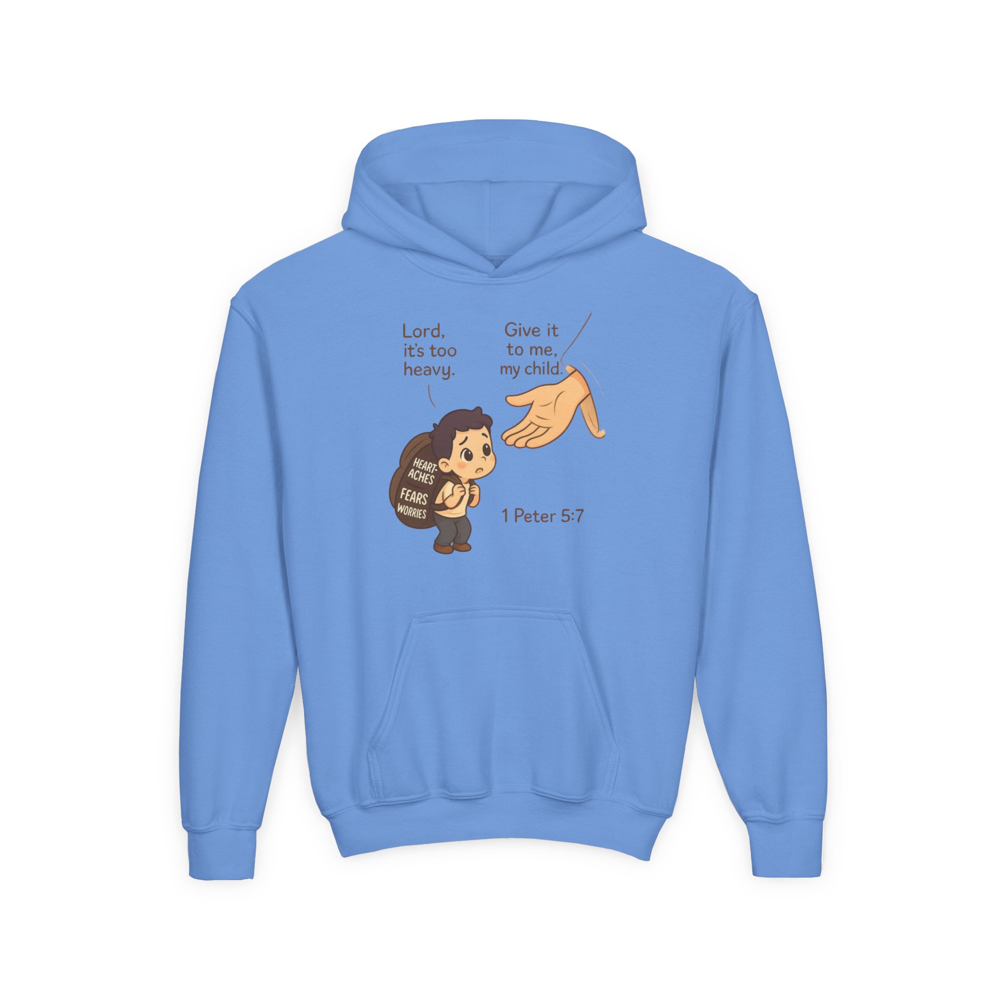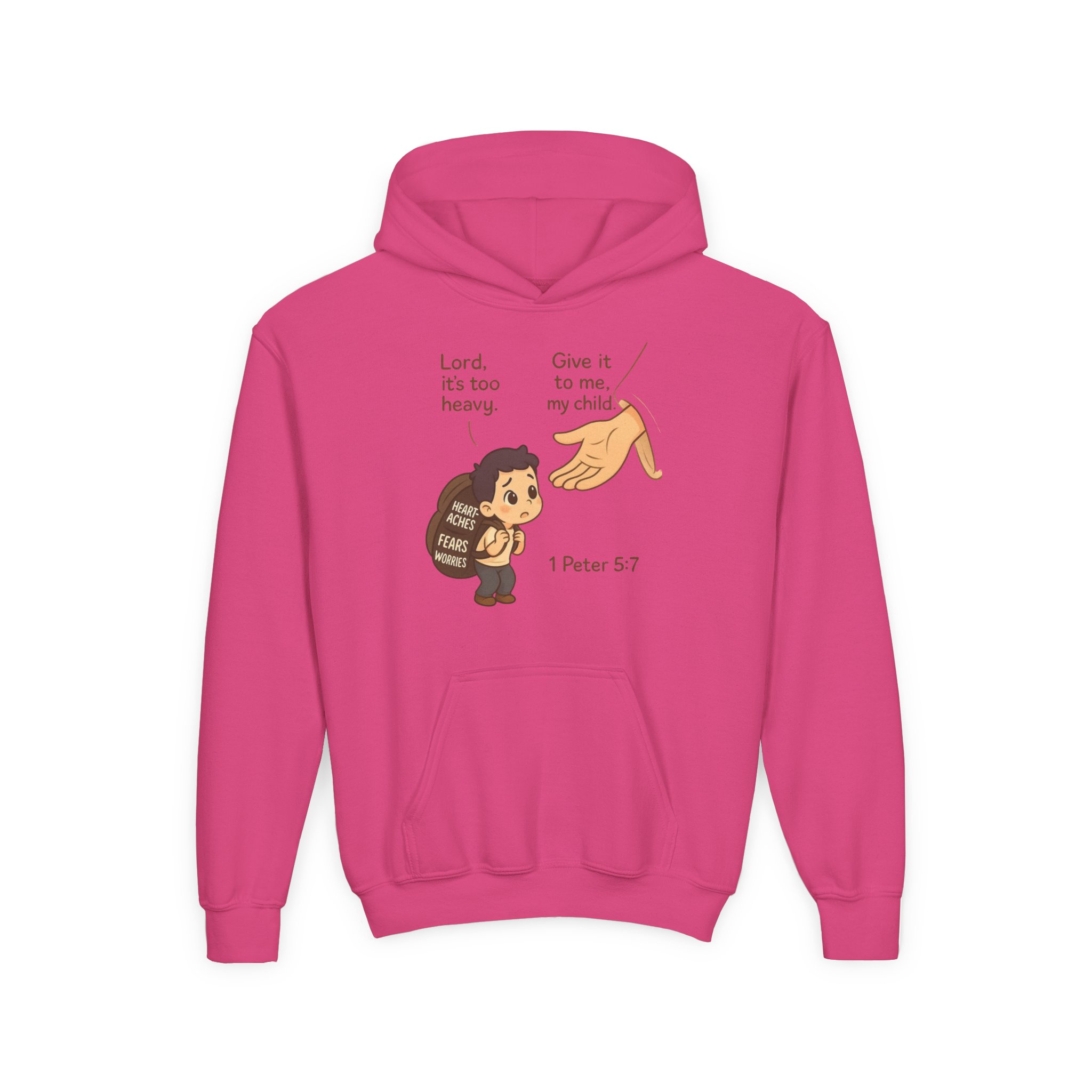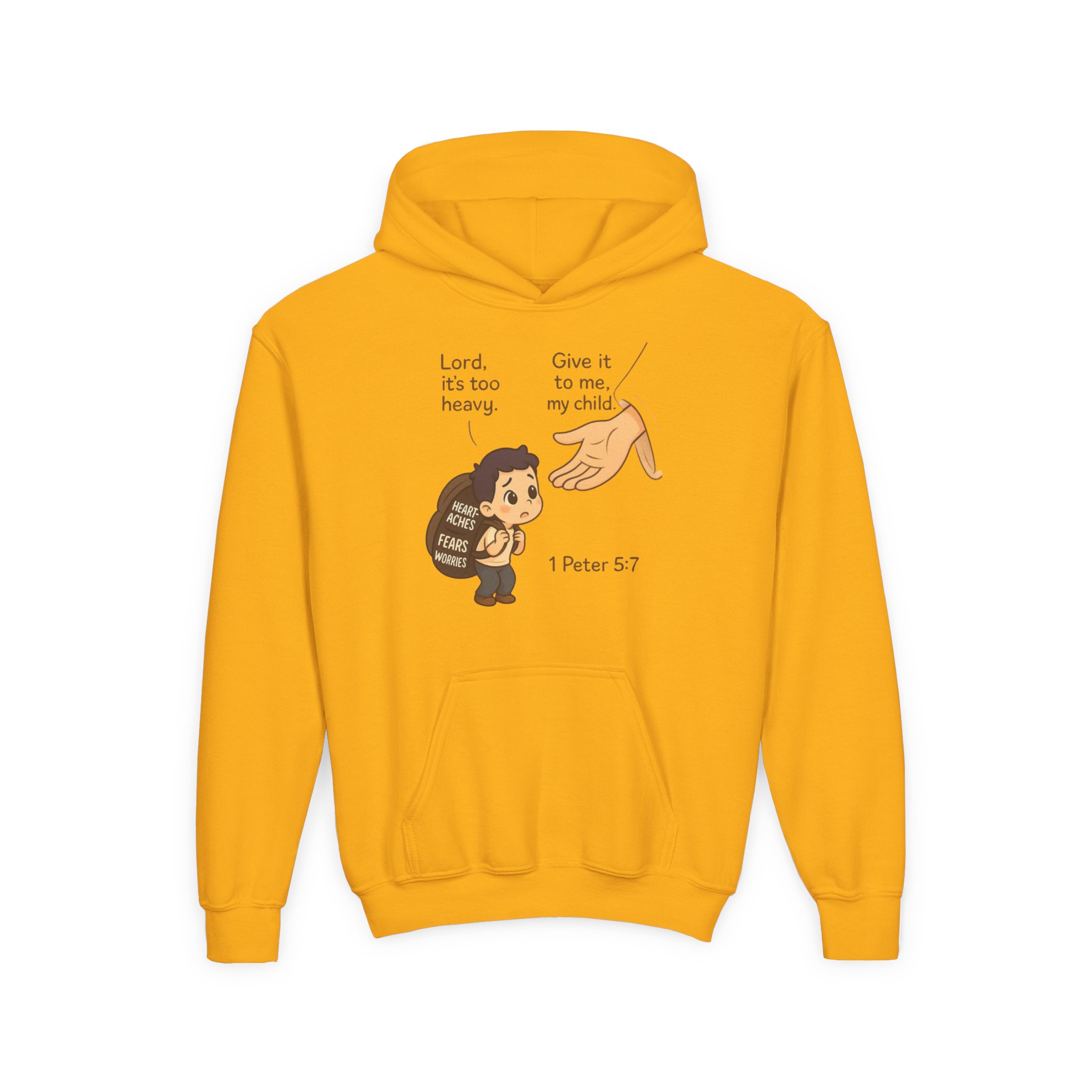 This youth hoodie carries a quiet, reassuring message wrapped in soft, sturdy fabric. A small, childlike character carries a heavy burden while a gentle hand reaches down with the words “Give it to me, my child” and the verse reference 1 Peter 5:7. The design reads like a warm, simple promise — a reminder to let go of worries and trust. Medium-weight fleece holds the print clearly and keeps the wearer cozy. Thoughtful details like a roomy kangaroo pocket, twill necktape, and true-to-size cut make it easy for kids to slip on and feel held. Available with optional left- or center-chest embroidery for a subtle, elevated touch.