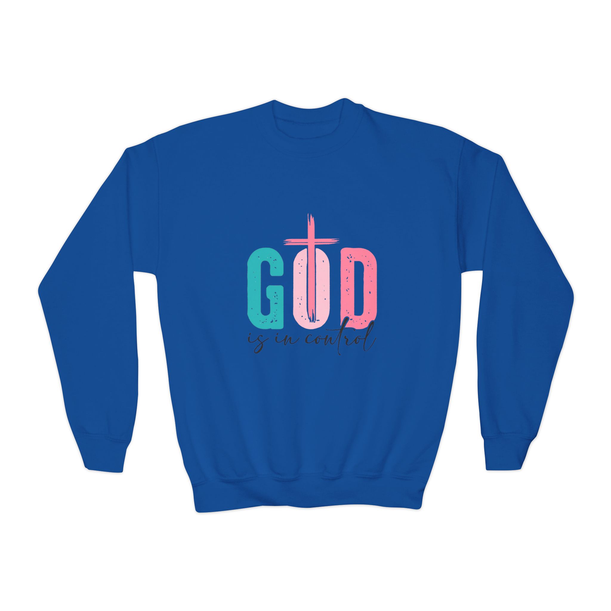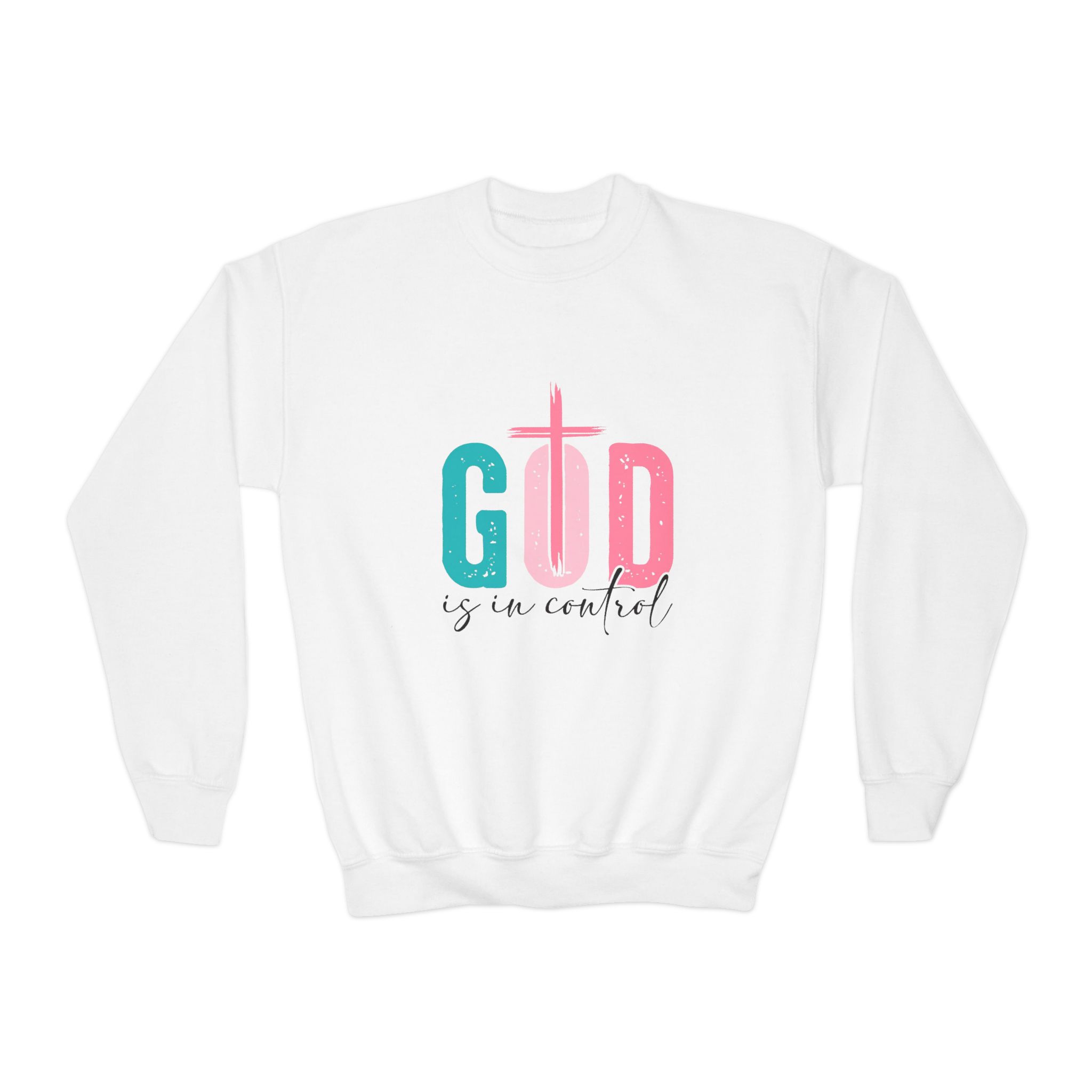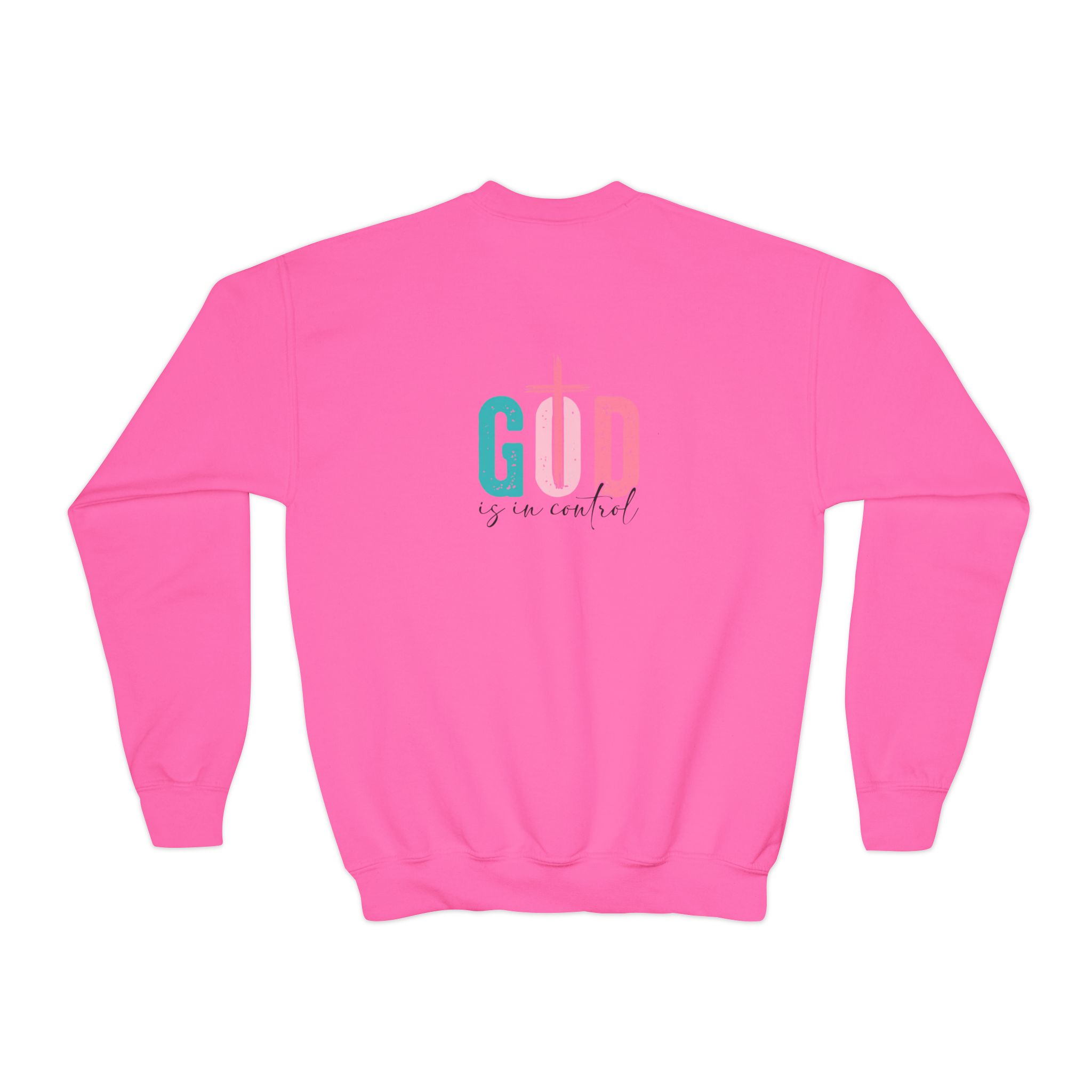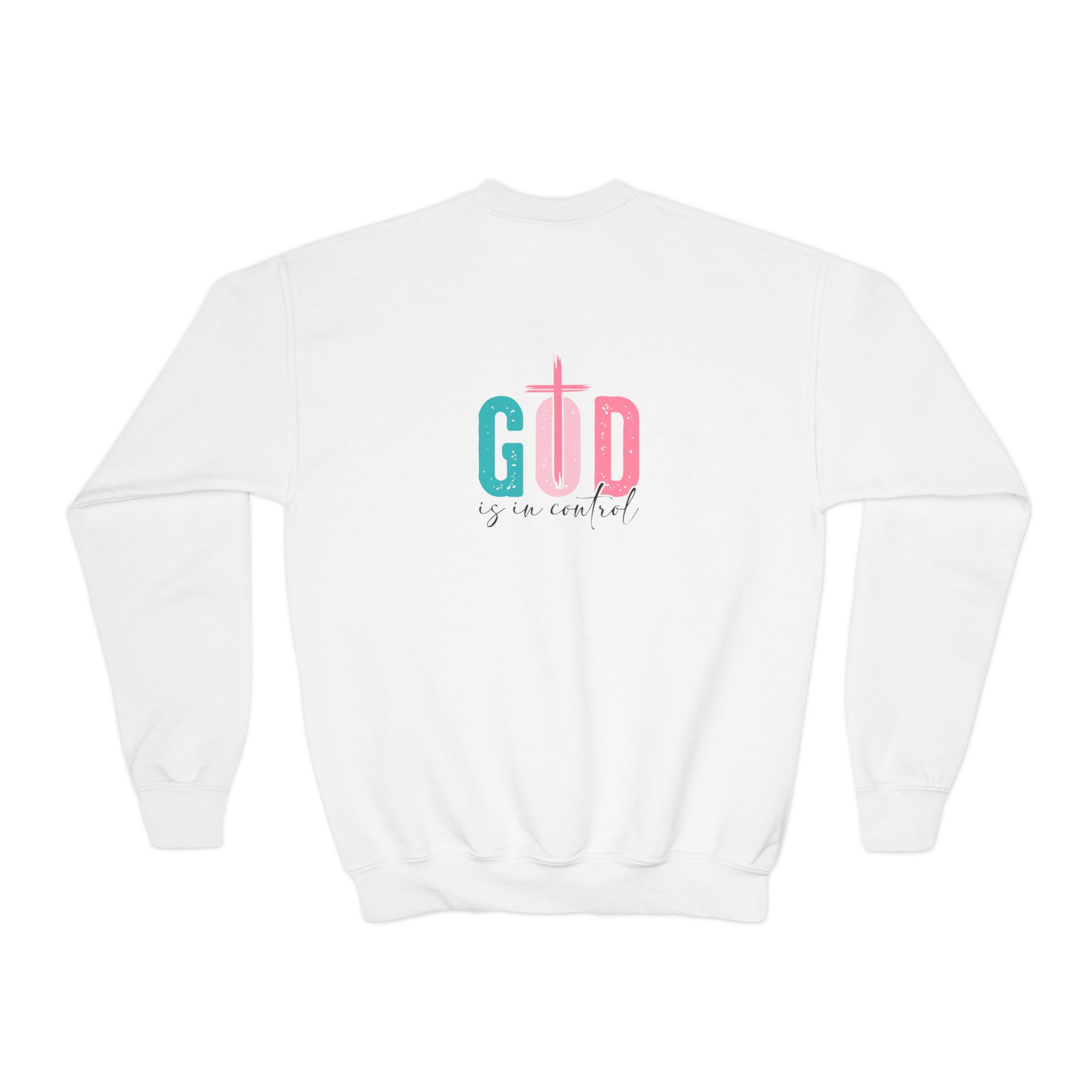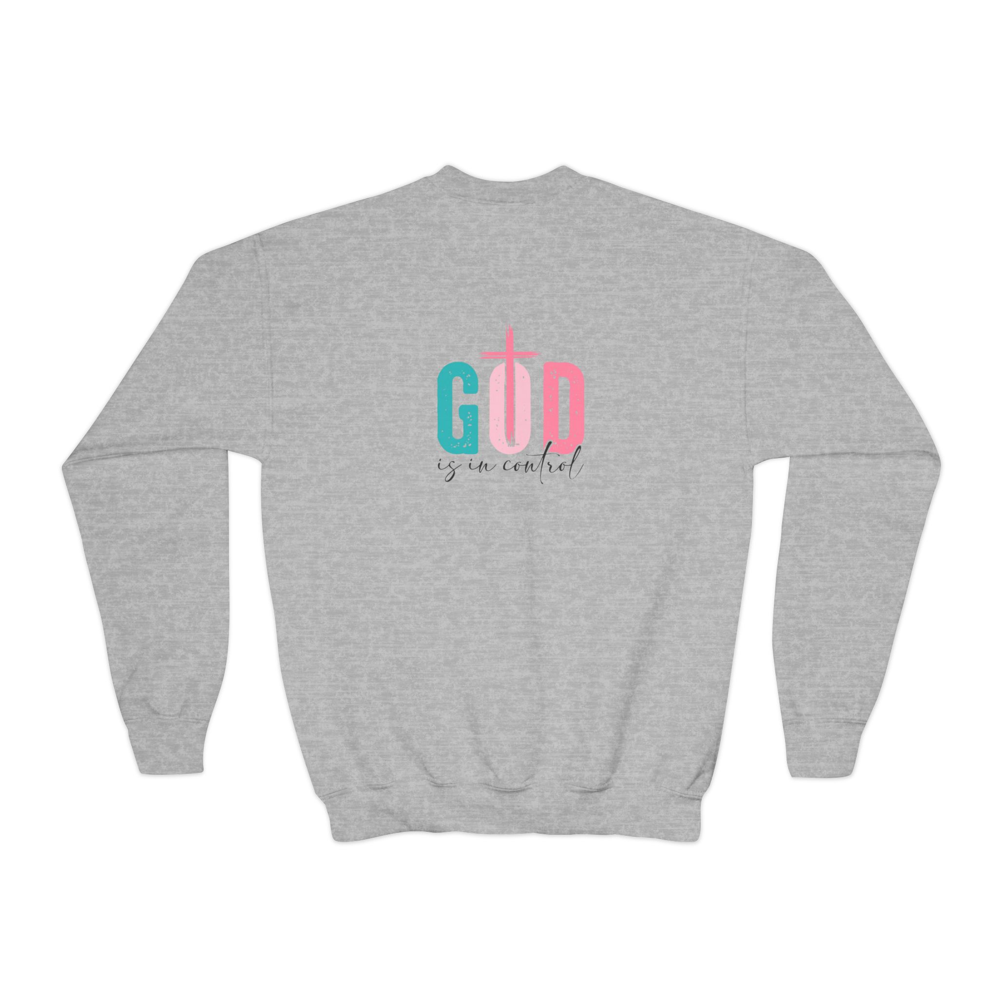 Soft, cozy, and thoughtfully designed for kids who love to wear their faith with gentle style. This youth crewneck sweatshirt pairs a relaxed, roomy fit with medium-heavy fabric that holds up to play and repeat washing. The pastel teal and pink graphic—built around a cross motif—reads warm and hopeful, placed both on the chest and across the back so the message is seen from every angle. Knit without side seams for a clean, comfortable finish, and offered with the option of subtle embroidery on the chest for a tactile, heirloom touch. Breathable yet durable, it moves easily through school days, church gatherings, and weekend adventures while meeting safety and compliance standards for children’s wear.