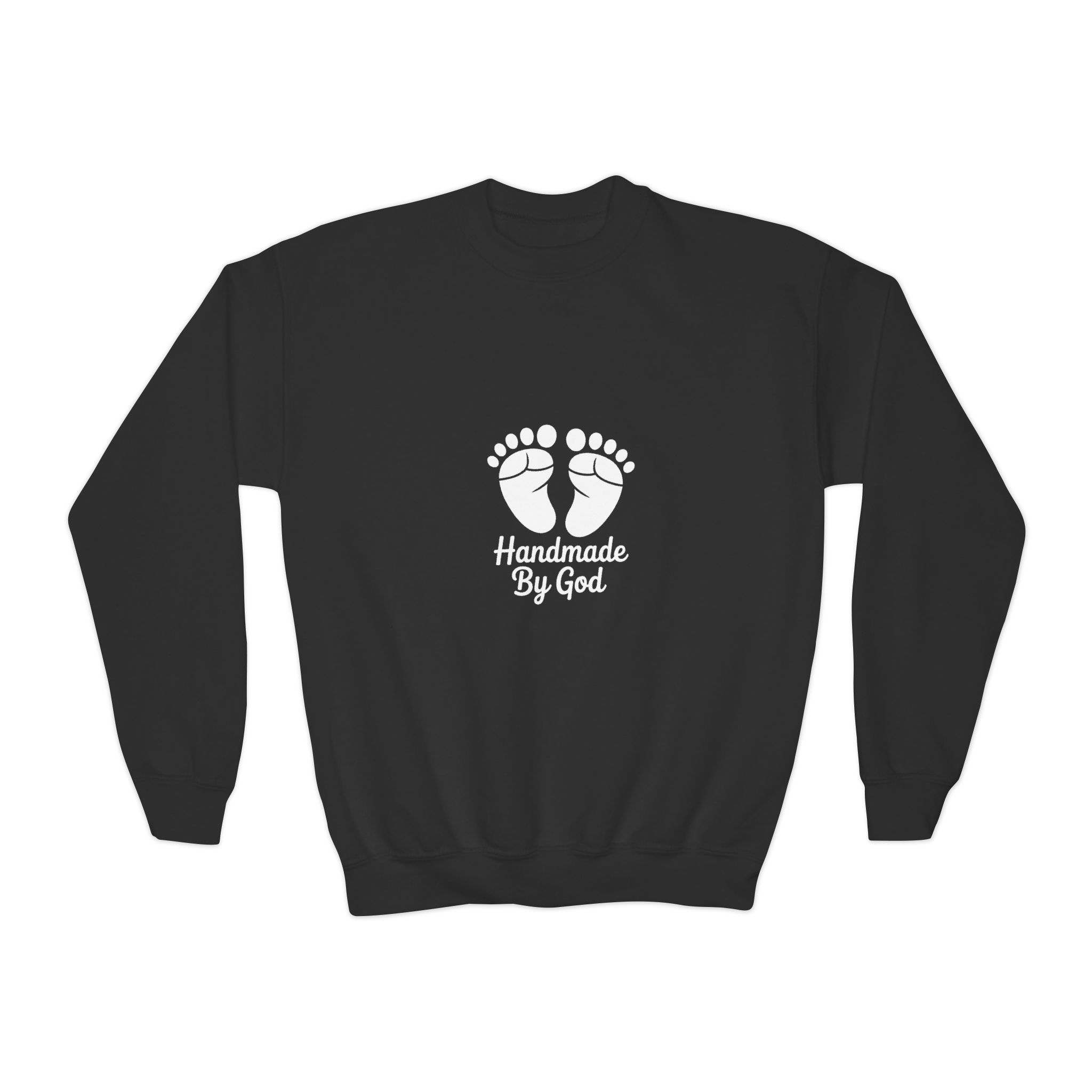 Soft, cozy, and made for little ones who are celebrated every day. This youth crewneck sweatshirt carries a simple, heartfelt graphic of tiny footprints above the words “Handmade By God,” printed on a medium‑heavy knit that holds up to play and repeated washes. The loose fit and ribbed collar give room to move while keeping shape, and the tear‑away label keeps the neckline comfortable. It’s finished with an option for delicate left‑chest or center‑chest embroidery if you prefer a subtle stitched version. Durable 50/50 cotton‑polyester fabric resists shrinking and wear, while the tubular knit construction reduces seams and creates a clean, classic silhouette that families will reach for again and again.