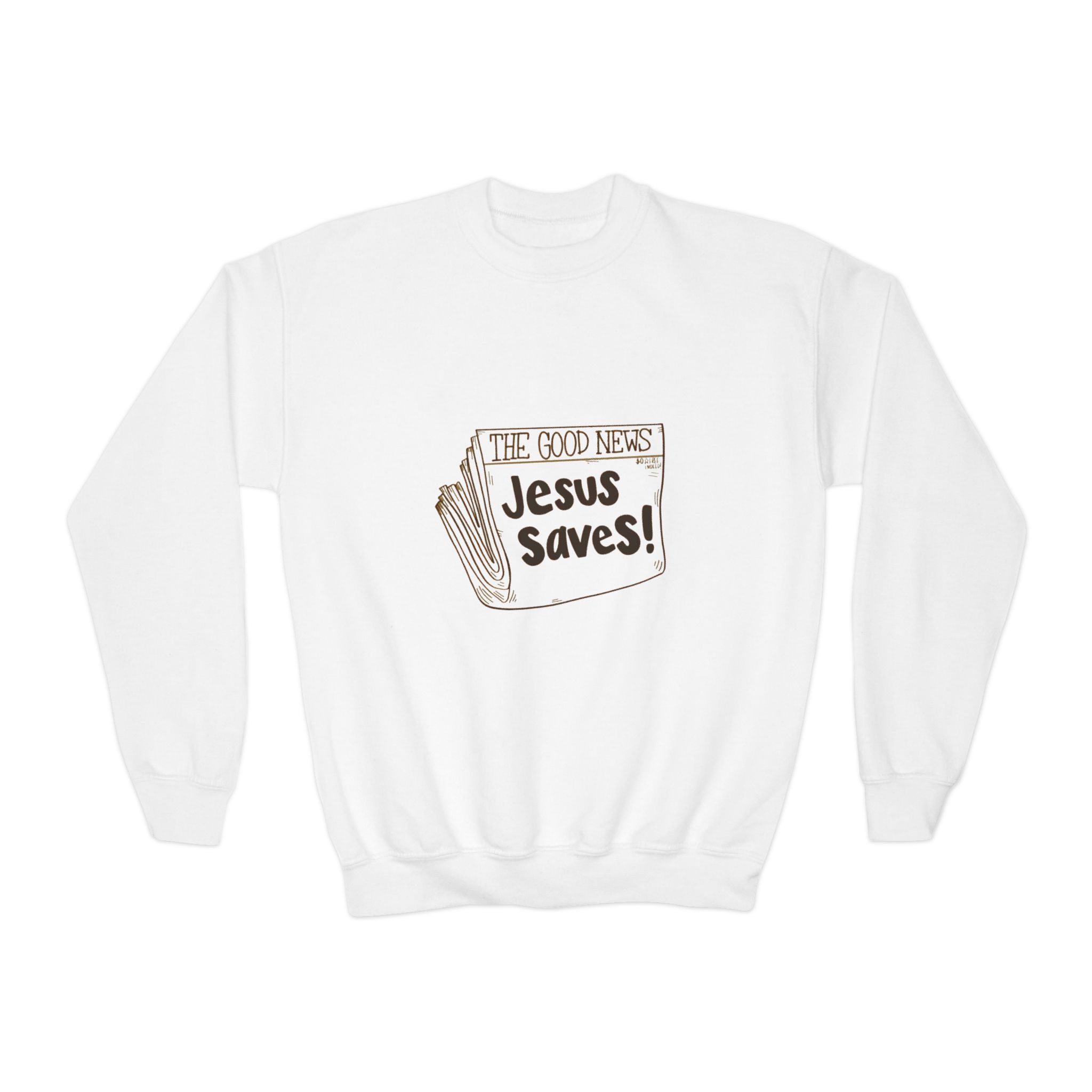 This cozy youth crewneck brings gentle faith-forward style to everyday wear. The soft, medium-heavy knit feels substantial without being stiff, and the loose fit lets kids move freely—recess, choir practice, or Sunday school. A simple, hand-drawn “Jesus Saves!” newspaper graphic sits on the chest for an approachable, vintage-inspired look that reads like a little declaration rather than loud branding. Finished with a ribbed collar and cuffs, a tear-away label for comfort, and the option for embroidered placement on the chest, it’s built to withstand play and repeated washes while keeping its shape and message intact.