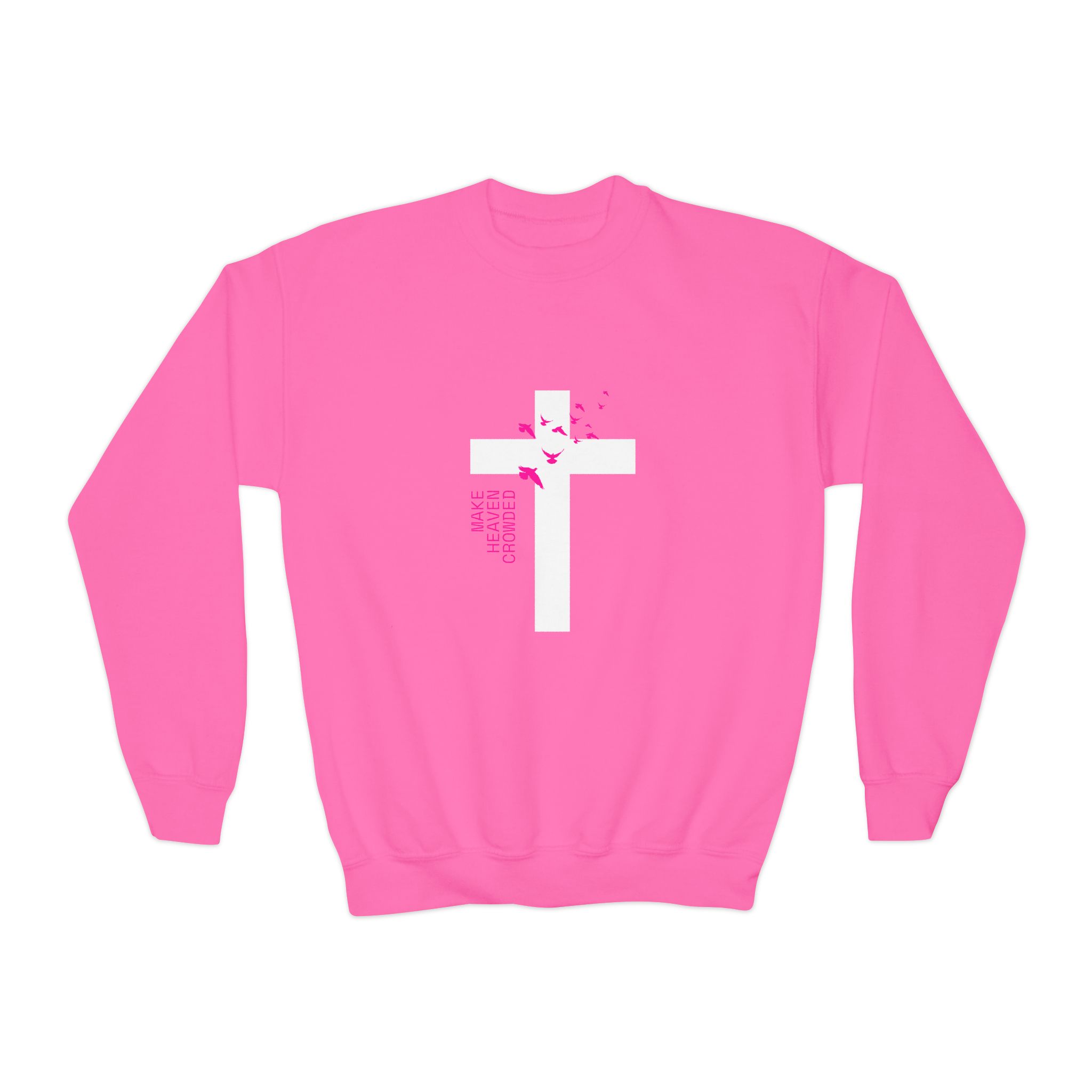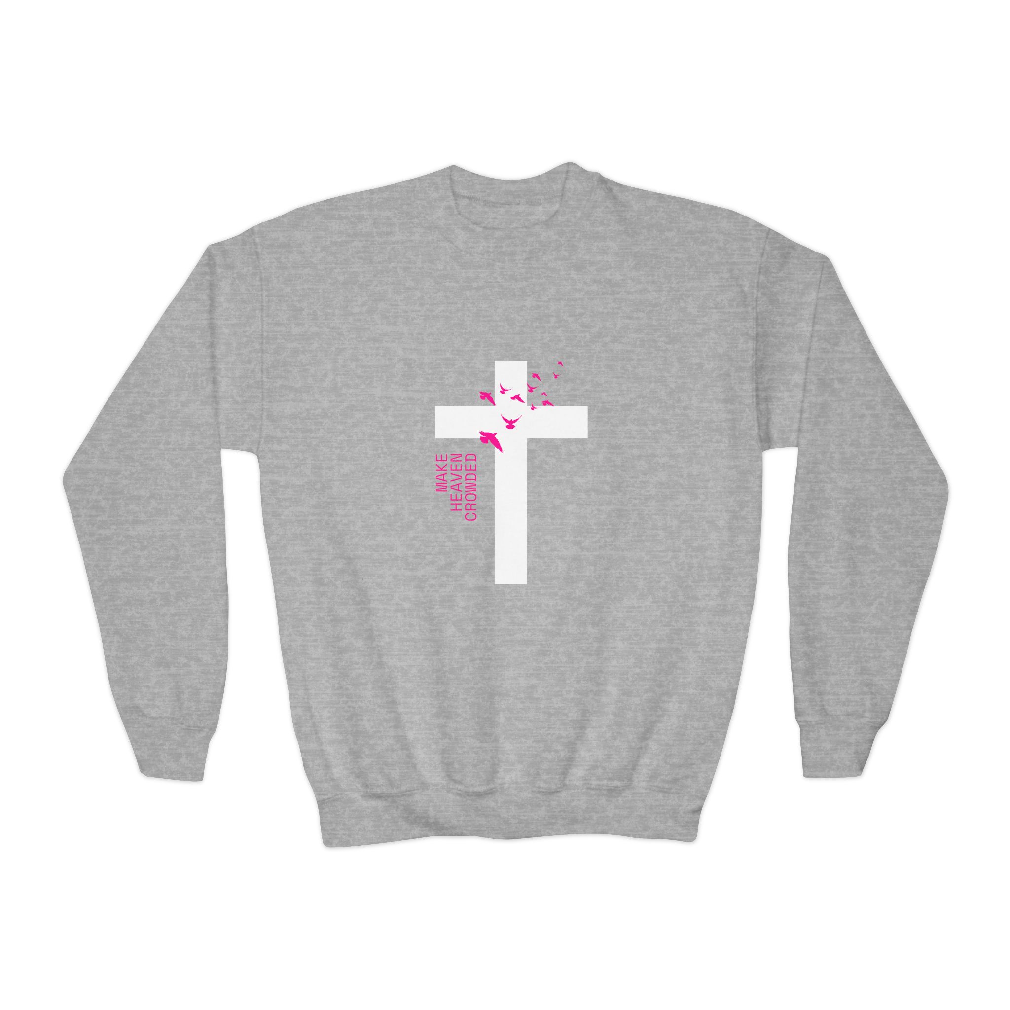 A soft, roomy crewneck that wears like a warm hug for active kids who carry quiet faith. The light heather gray sweatshirt features a clean white cross on the chest with a small cluster of pink birds and subtle distressed text — a low-key, reverent design that reads as gentle and hopeful rather than flashy. The medium-heavy knit and loose fit make it easy to layer over tees or under jackets for Sunday mornings, youth group outings, or cool playground afternoons. Durable cotton-poly construction holds up to repeated washes and maintains shape; ribbed collar and cuffs keep the silhouette neat while the tear-away label keeps little necks comfortable. Offered with the option to add embroidery on the left or center chest for a personalized touch.