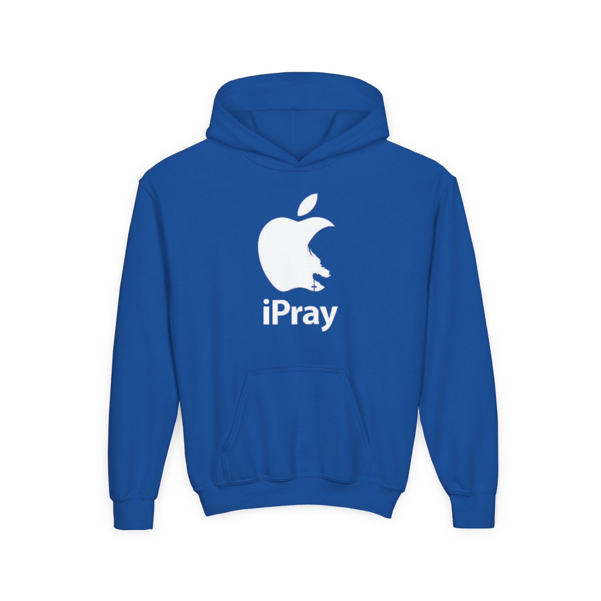 A soft, midweight youth hoodie with a bold, tongue-in-cheek graphic that blends tech culture and faith. The black sweatshirt features a white silhouette logo on the chest that resembles a bitten apple with a small silhouette of a praying figure and the word “iPray” beneath it. It feels lived-in from the first wear—warm, roomy, and built to move with busy kids. The kangaroo pouch keeps hands warm and stores small treasures, while the twill necktape and sewn-in label add subtle durability and comfort. Printed using DTG for the main design with DTF wrist accents (where applicable), and also available with left- or center-chest embroidery for a refined look. Meets safety and compliance standards and runs true to size.
