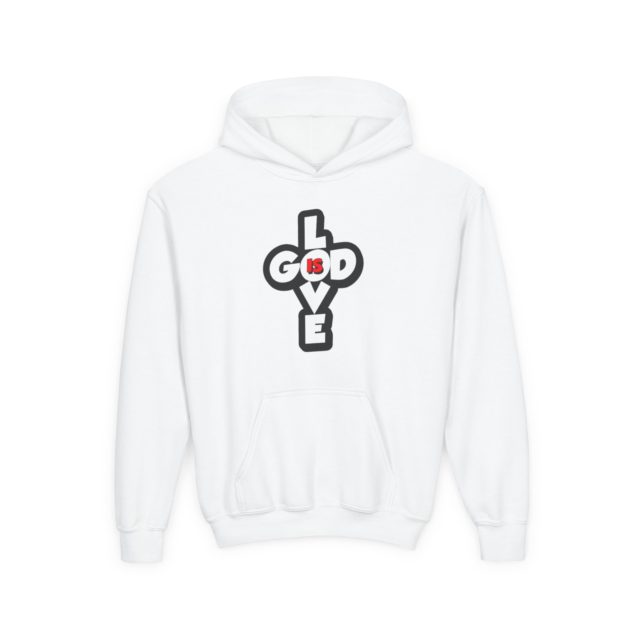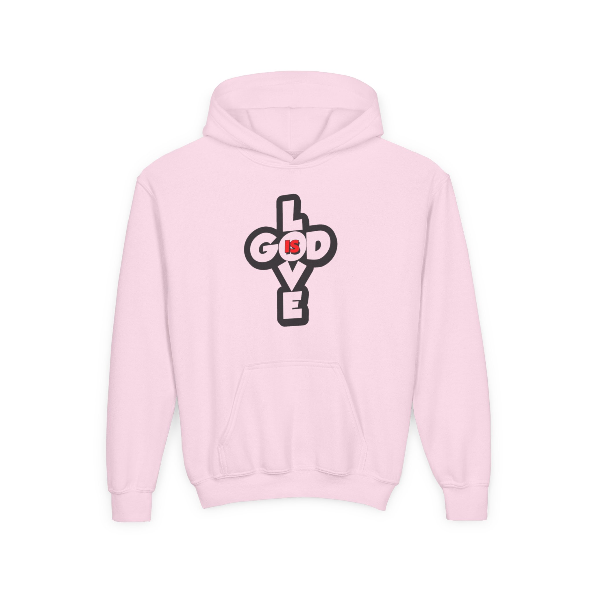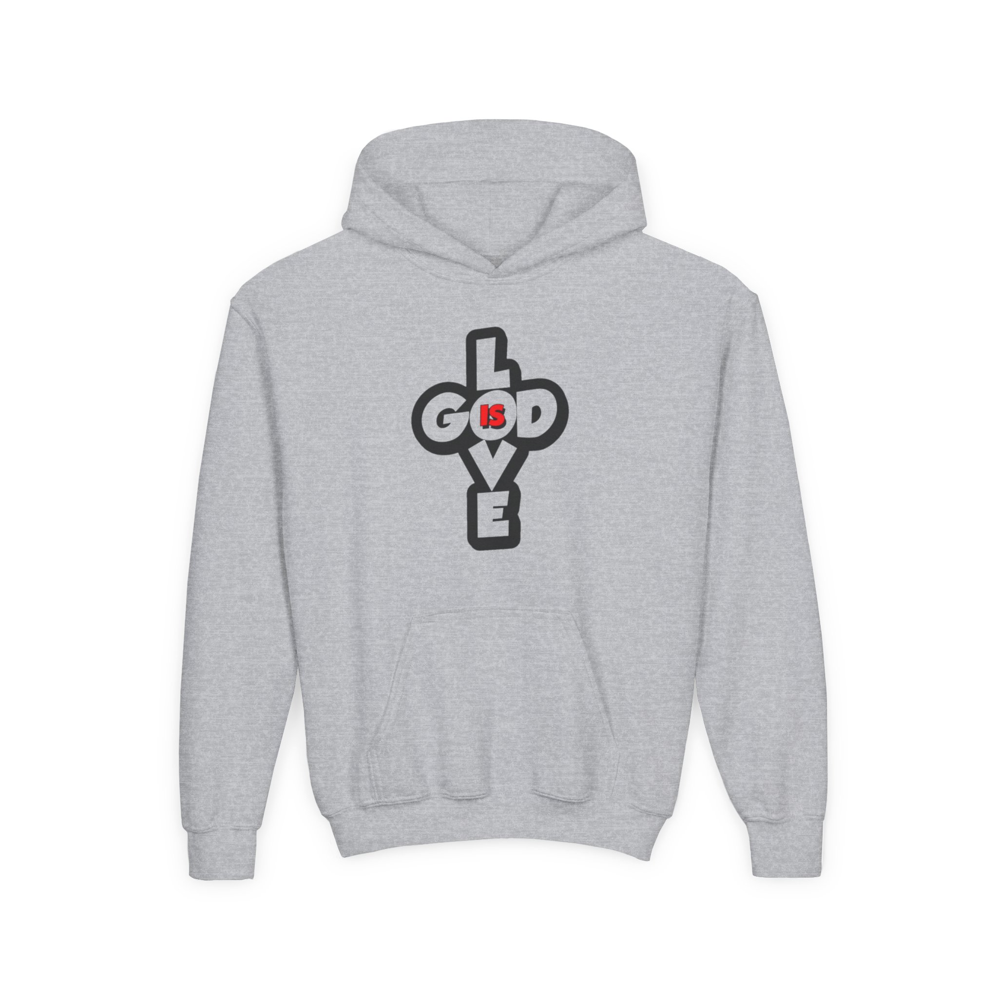 This cozy youth hoodie carries a bold, graphic message that’s both playful and sincere. The front features a stacked typographic cross that reads “LOVE” with a small red heart at its center, giving the piece an approachable, street-inspired look. Midweight fleece hugs the body without feeling bulky. A roomy kangaroo pocket and a soft, lined hood add everyday comfort, while durable ribbed cuffs and hem keep the shape through active days. The print combines DTG body art with DTF wrist details; embroidery placement options are available for a subtle chest accent. It’s the kind of hoodie a kid reaches for when they want something soft, warm, and a little expressive.