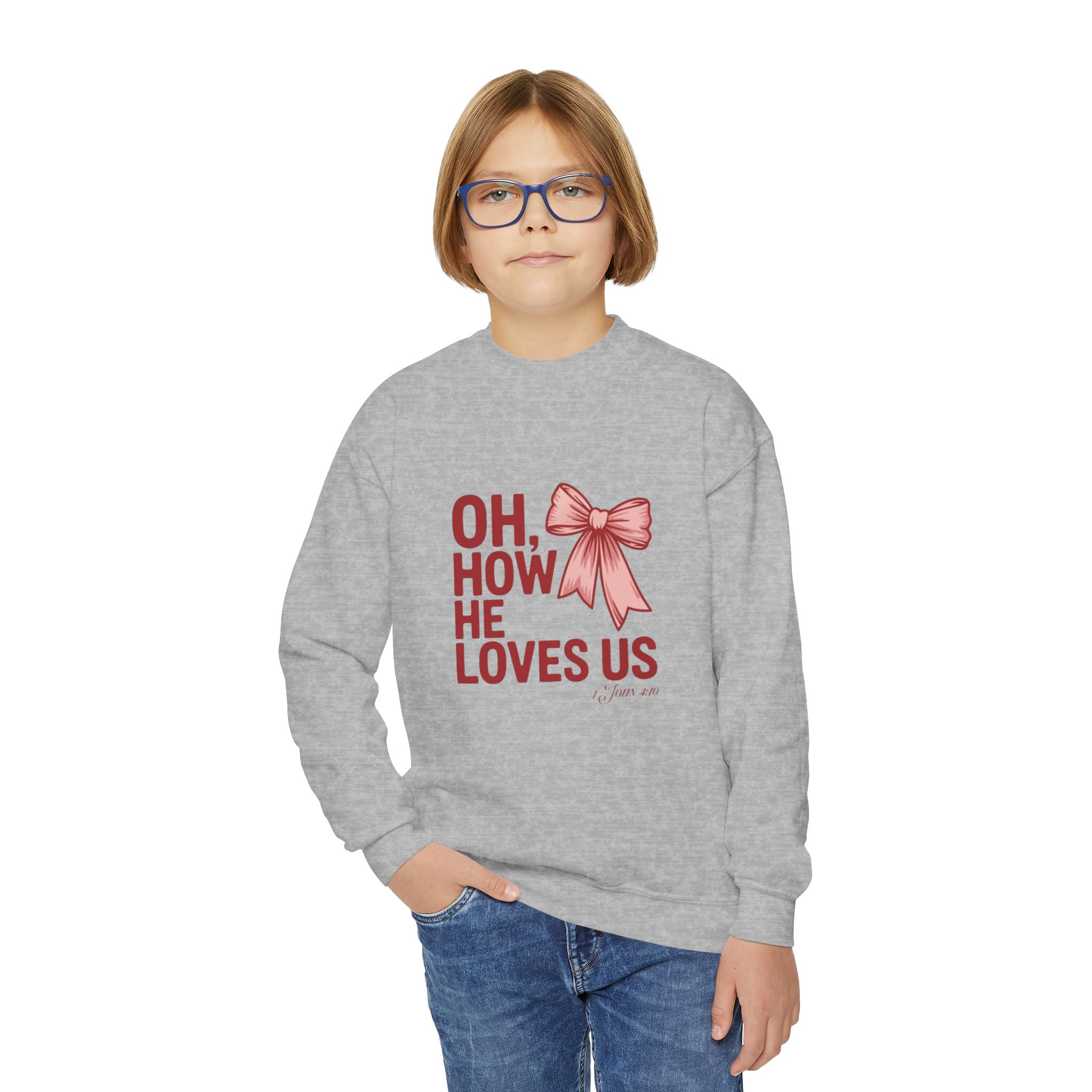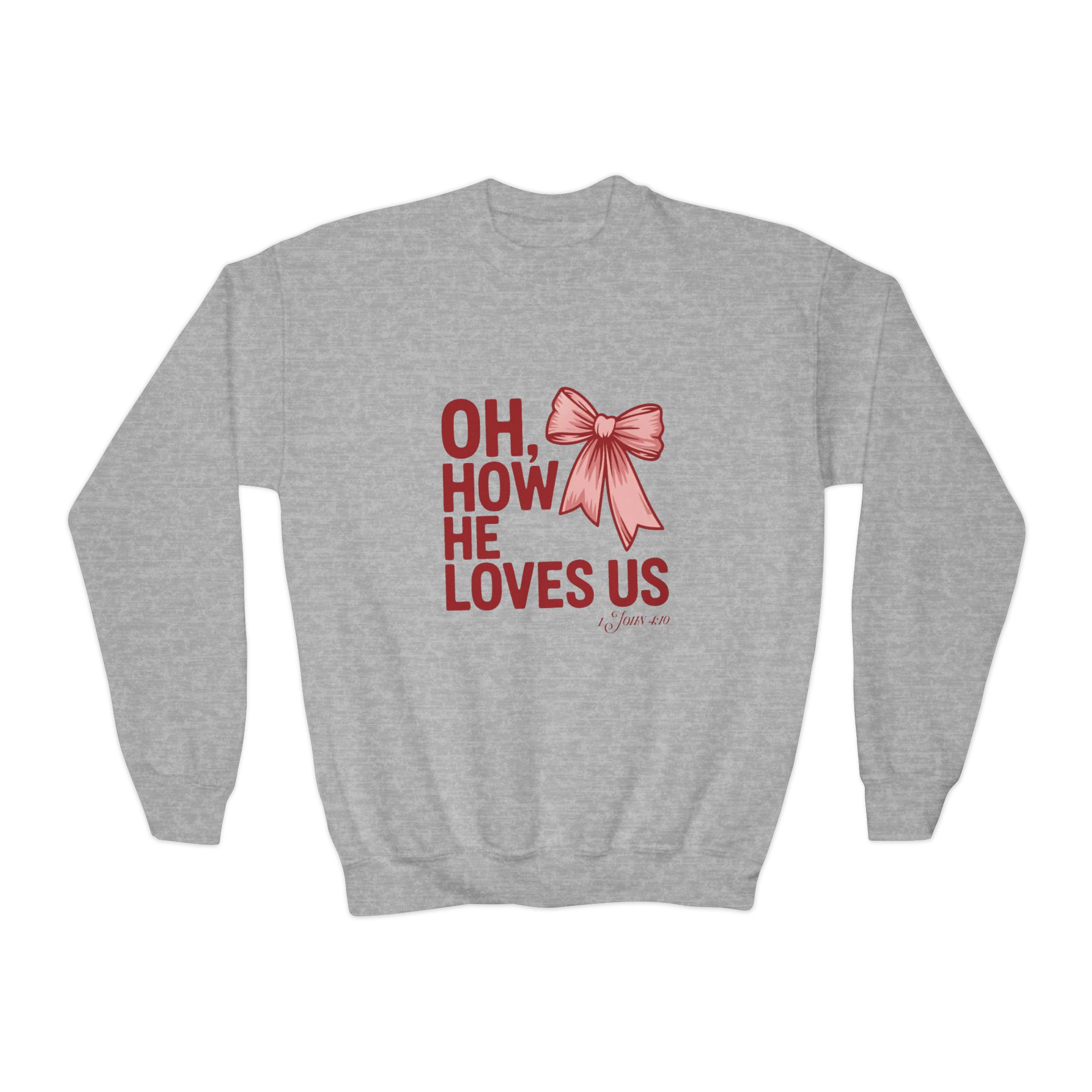 Soft, cozy, and quietly joyful — this youth crewneck sweatshirt wears its heart on the chest. A hand-drawn ribbon sits beside the phrase “OH, HOW HE LOVES US,” rendered in warm, slightly rustic lettering that reads like a handwritten note. The sweatshirt’s relaxed, loose fit and medium-heavy knit give it a comforting hug for little ones. It pairs easily with jeans, leggings, or pajamas and layers under coats on chilly mornings. Let it be the sweater your child reaches for when you want them to feel loved, seen, and wrapped in calm assurance during family mornings, holiday sing-alongs, church gatherings, or simple everyday play.